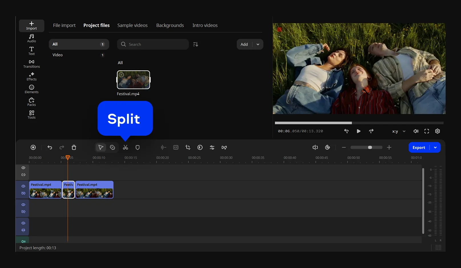 Place the video on the timeline and move the playhead to the exact position where the cut should appear. Click the Split tool to separate the clip into segments. After splitting, select the unwanted parts and delete them from the timeline if needed.