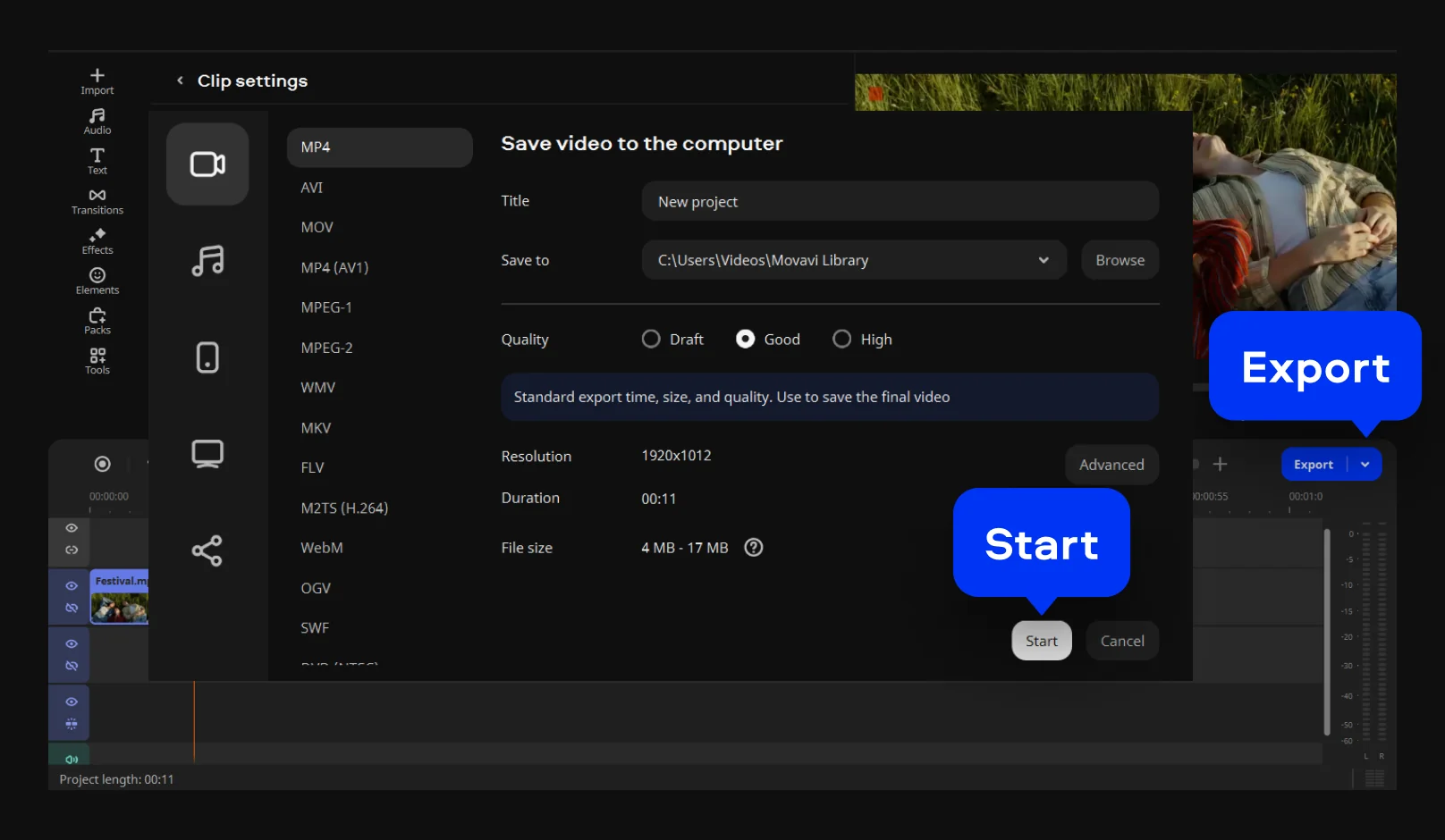 *The free version of Movavi Video Editor may have the following restrictions depending on the build: watermark on exported clips, 60-second video or 1/2 audio length limit, and/or some advanced features unavailable when exporting videos.