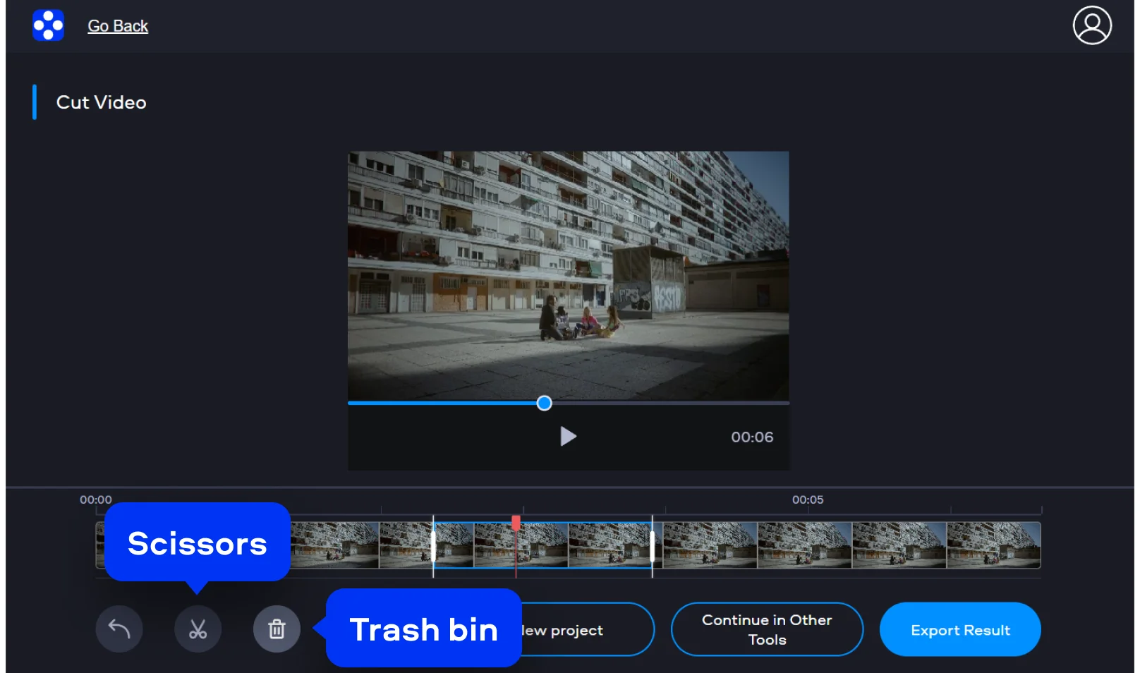 Use the timeline to navigate through the video and find the moments where it should be divided. Place the playhead at the required position and click the Scissors icon to cut the video. Move the markers as needed and preview the selected sections to confirm that the cuts appear at the correct points, delete unwanted parts by pressing the Trash bin icon.