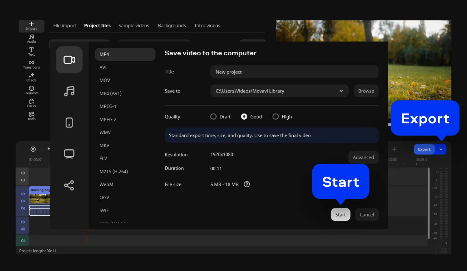 *The free version of Movavi Video Editor may have the following restrictions depending on the build: watermark on exported clips, 60-second video or 1/2 audio length limit, and/or some advanced features unavailable when exporting videos.