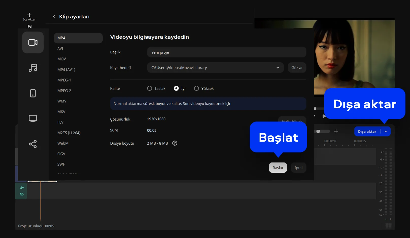 *Movavi Video Editor'ın ücretsiz sürümünde, derlemeye bağlı olarak şu kısıtlamalar olabilir: dışa aktarılan kliplerde filigran, 60 saniyelik video veya 1/2 ses uzunluğu sınırı ve/veya videoları dışa aktarırken bazı gelişmiş özelliklerin kullanılamaması.