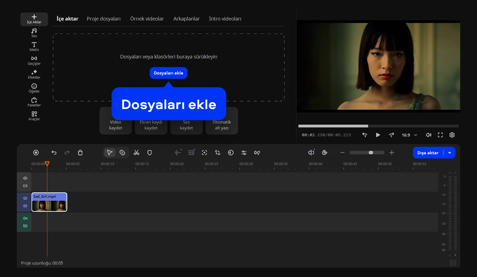 Bilgisayarınızda Movavi Video Editor’ı açın ve düzenlemek istediğiniz videoyu içe aktarmak için Dosyaları ekle düğmesine tıklayın. Dosya medya kütüphanesinde göründüğünde, onu ekranın alt kısmındaki zaman çizelgesine sürükleyin. Bu aşamada, gerekirse daha fazla düzenleme yapmadan önce videonun sesini kapatabilirsiniz.