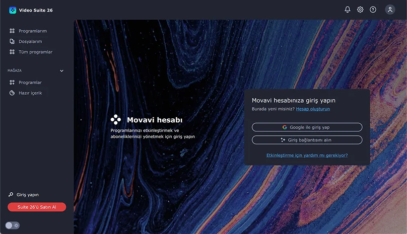 Movavi Video Suite'i etkinleştirmenin üç yolu vardır: Movavi hesabına giriş yaparak, Video Suite'e etkinleştirme anahtarı girerek, Video Suite dâhilindeki programlar aracılığıyla.