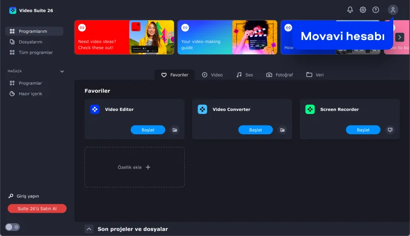 Movavi hesabınıza giriş yapmak için başlatıcının sağ üst köşesindeki simgeye tıklayın.