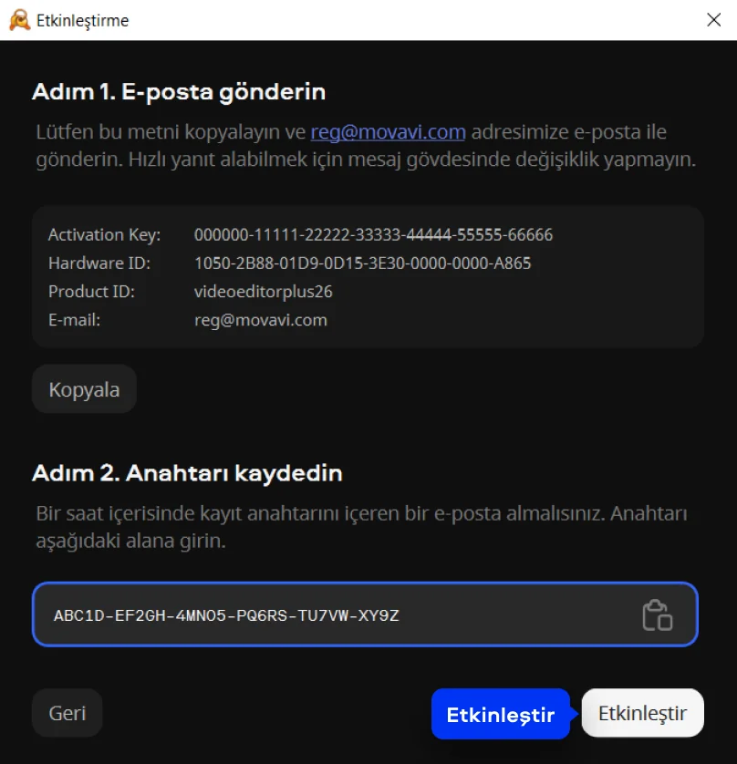 Size gönderdiğimiz e-postadan etkinleştirme anahtarınızı kopyalayın ve kurulum penceresindeki uygun alana yapıştırım.