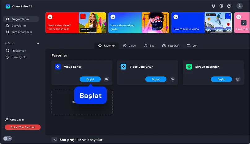 Program ana ekranından Video Editor'ı başlatın. Uygulamayı, varsayılan olarak açık olan Favoriler sekmesinde veya Programlar bölümünde bulabilirsiniz.