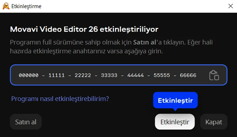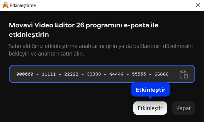 Satın alma işleminden hemen sonra etkinleştirme anahtarını e-posta ile aldınız. Bu anahtar sadece rakamlardan oluşur.Kayıt anahtarını, support@movavi.com e-posta adresinden gelen bir e-postada aldınız. E-postanın konusu Activation Information. Bu anahtar, rakamlardan ve büyük Latin harflerinden oluşur.