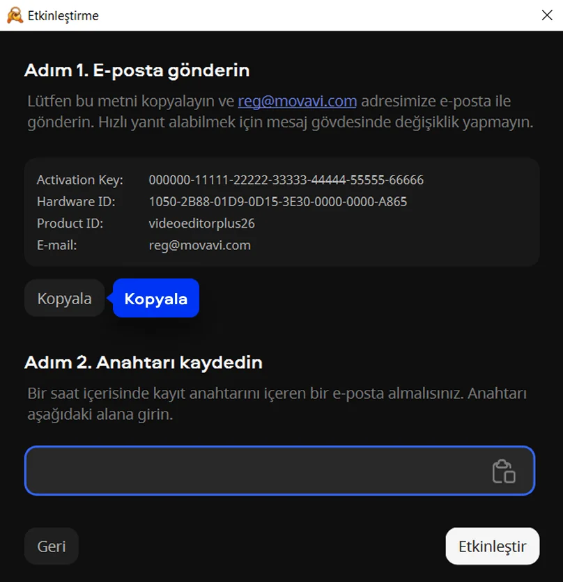 E-postadaki kayıt anahtarını Etkinleştirme iletişim kutusundaki ilgili alana kopyalayın.