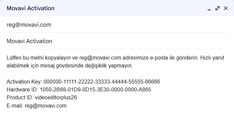 İnternet erişiminiz varsa, e-postayı oluşturmak için tercih ettiğiniz posta istemcisini kullanın. Mesaj gövdesine, Etkinleştirme iletişim kutusundan kopyaladığınız bilgileri yapıştırın. Ardından e-postayı reg@movavi.com adresine gönderin.
