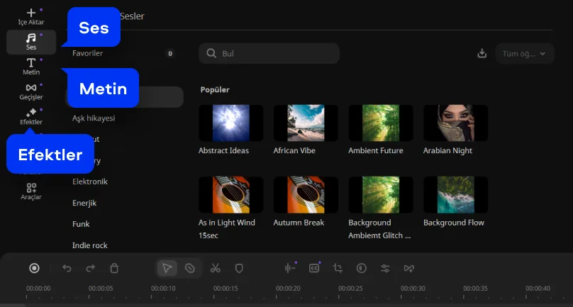 Efektler etkinleştirildi ve kullanılmaya hazır. Movavi Effects içeriğini program penceresinin sol tarafındaki sekmelerden bulabilirsiniz. Mevcut müzik parçalarını, başlıkları, geçişleri ve daha fazlasını görmek için sekmelere tıklayın.