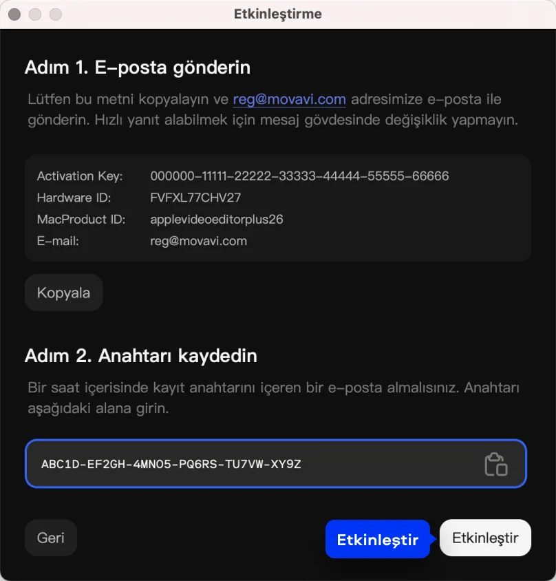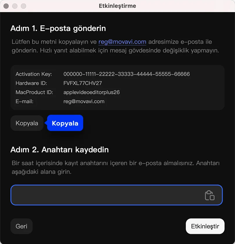 E-postadaki kayıt anahtarını Etkinleştirme iletişim kutusundaki ilgili alana kopyalayın.