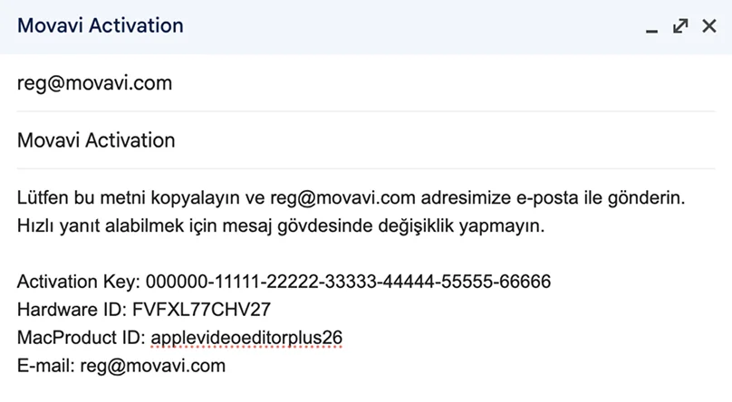 İnternet erişiminiz varsa, e-postayı oluşturmak için tercih ettiğiniz posta istemcisini kullanın. Mesaj gövdesine, Etkinleştirme iletişim kutusundan kopyaladığınız bilgileri yapıştırın. Ardından e-postayı reg@movavi.com adresine gönderin.