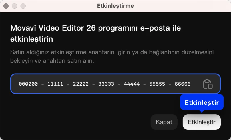 Satın alma işleminden hemen sonra etkinleştirme anahtarını e-posta ile aldınız. Bu anahtar sadece rakamlardan oluşur.Kayıt anahtarını, support@movavi.com e-posta adresinden gelen bir e-postada aldınız. E-postanın konusu Activation Information. Bu anahtar, rakamlardan ve büyük Latin harflerinden oluşur.