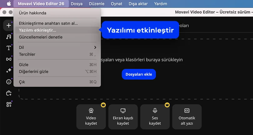 Movavi Video Editor'da program ana menüsüne gidin ve Yazılımı etkinleştir'i seçin.
