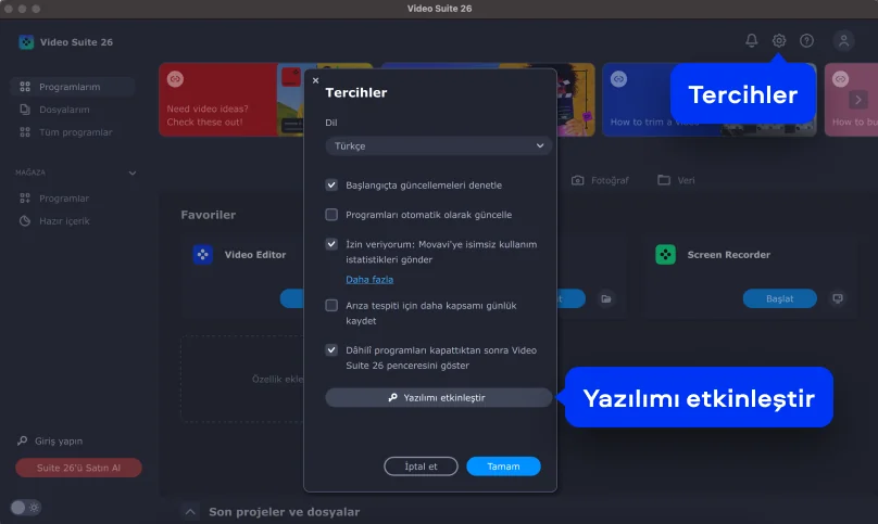 Video Suite'te anahtarınızla etkinleştirme