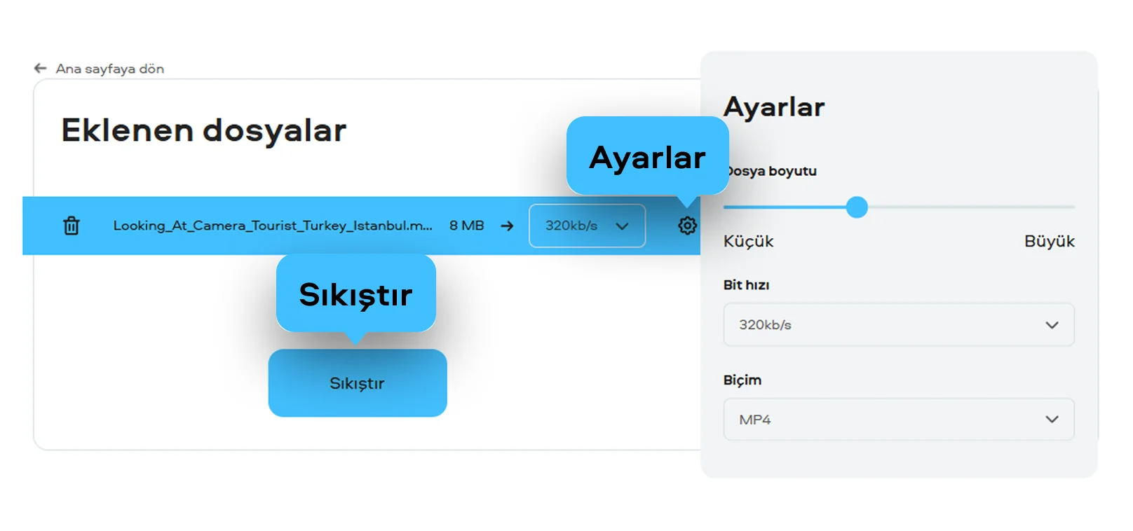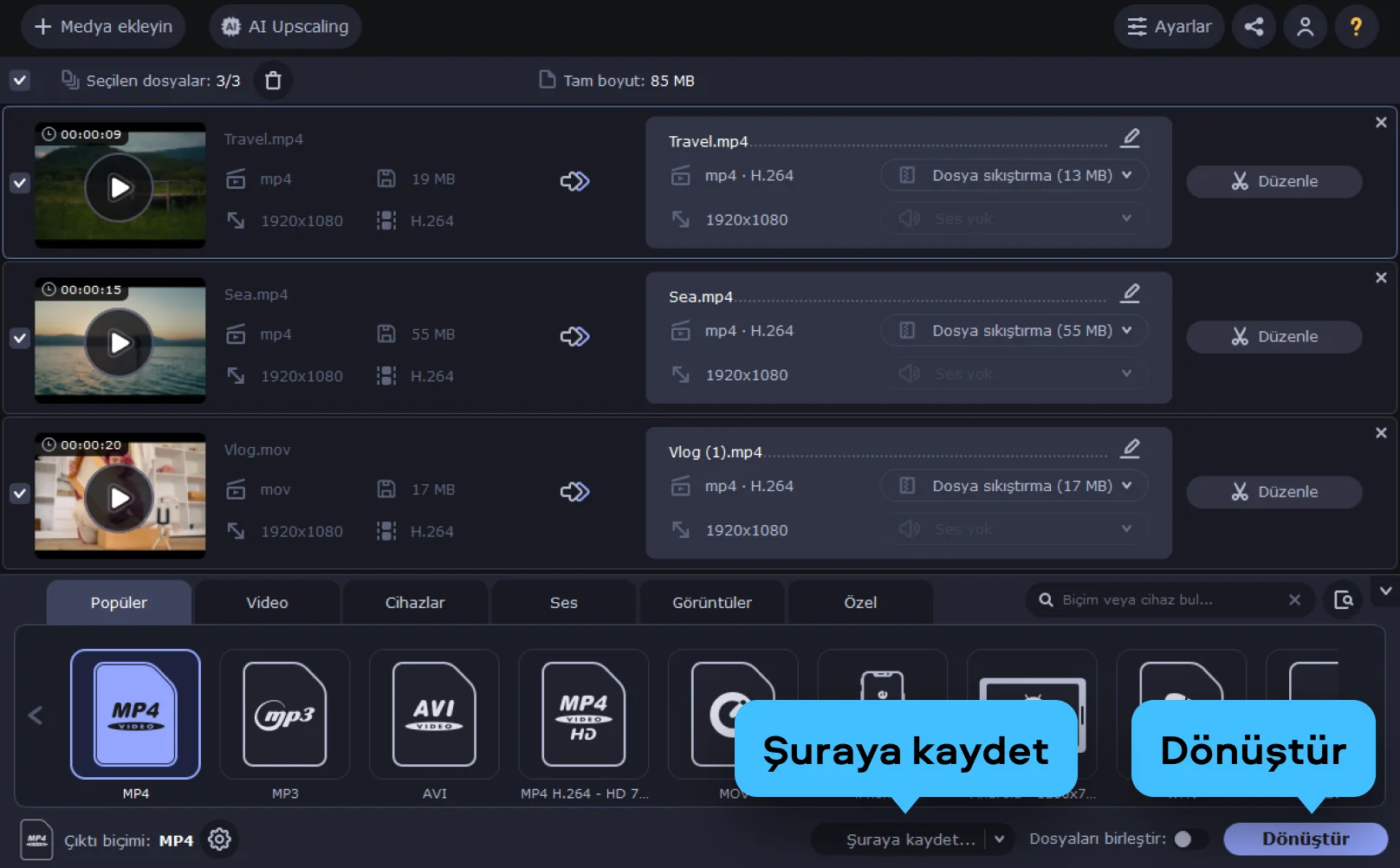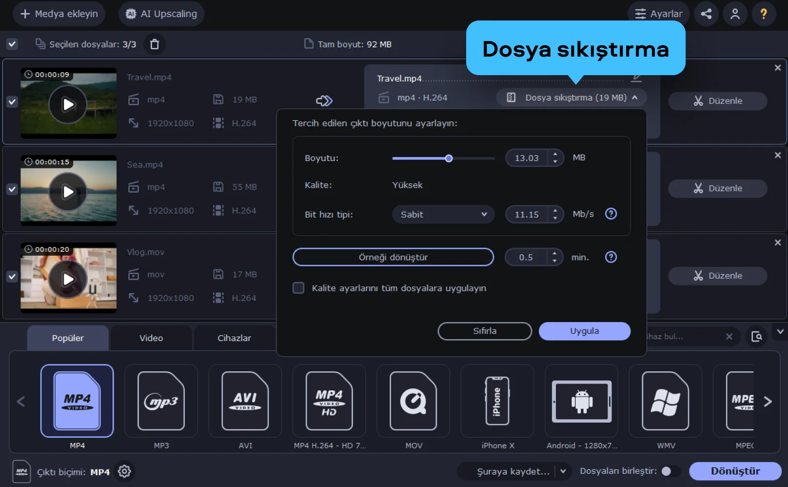 Bu ücretsiz online araç oldukça kullanışlıdır. MP4 sıkıştırma işlemini ve diğer popüler formatları destekler. İhtiyacınız ne olursa olsun, ister WhatsApp ister Discord için videolar sıkıştırmak isteyin, bu araç videolarınızın net ve profesyonel görünmesini sağlayan güvenilir bir çözümdür ve video boyutu küçültme işlemini kolaylaştırır.