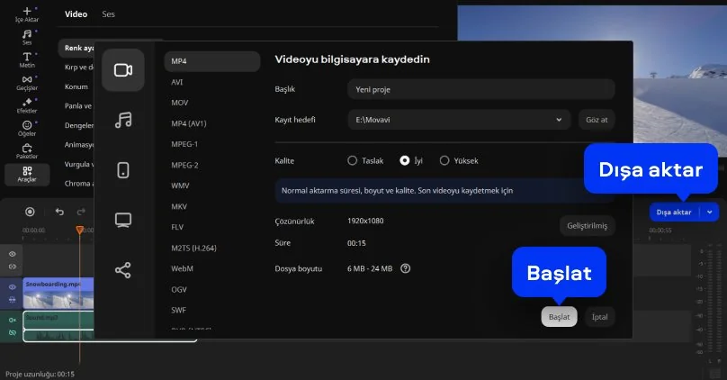 Sonuçtan memnun kaldığınızda görünen Dışa aktar düğmesine tıklayın. Tercih ettiğiniz formatı ve kalite ayarlarını seçin. Son olarak Başlat düğmesine basın.