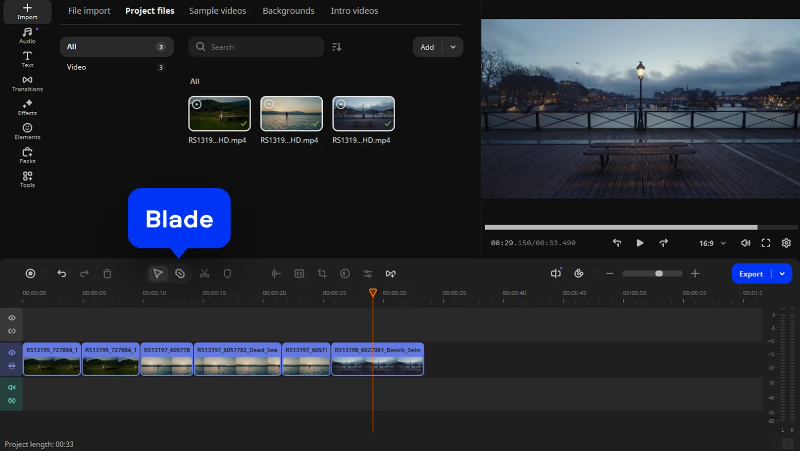Drag your clips onto the timeline in the order you want them to appear. Trim scenes with the Blade tool and adjust clip length to control pacing and keep the trailer fast and engaging.