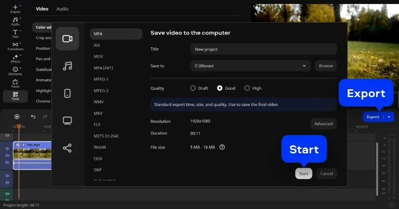 Click Export, pick a format (e.g., MP4), choose Quality and Resolution (up to HD/4K if available), set the save location, then press Start to render your video.