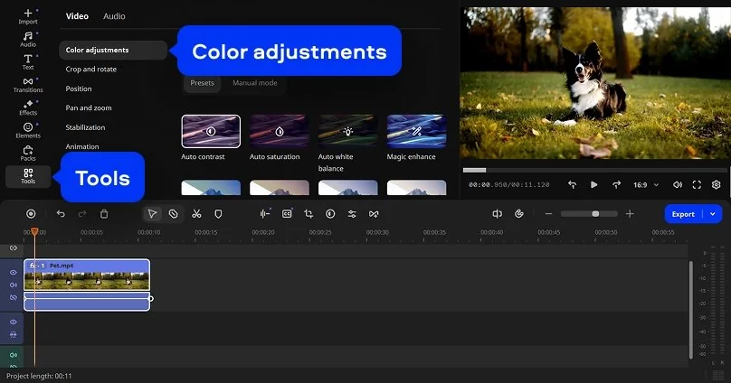 Open the Tools tab and select Color adjustments. You can select a ready-made preset or edit your video manually, adjusting parameters like Brightness, Contrast, and Saturation. Cut unwanted pieces, stabilize shaky footage, and apply AI enhancement tools to make every clip look sharp, balanced, and professional.