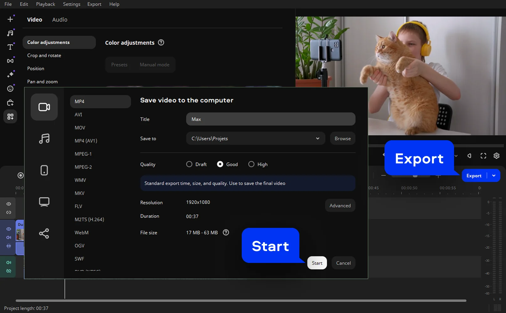 Click Export to save your project in the desired format and resolution. Your video now sounds fuller, clearer, and actually audible – as it should have from the start.
