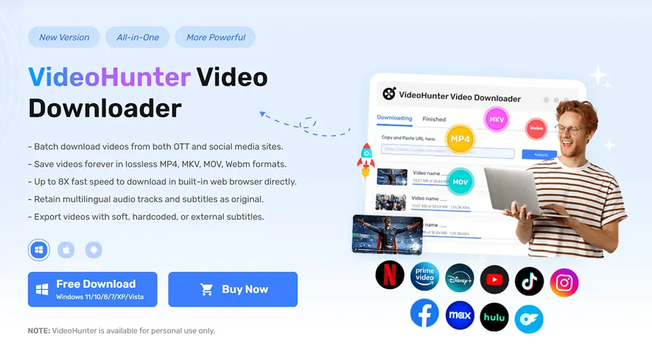 VideoHunter 可免費試用,且相容 1000+ 個網路平台的影片和音樂,例如 YouTube、Facebook……,熱門網站的影片統統都可以下載保存起來。無論是下載 MP4 影片或 MP3 音樂,還是將影片轉檔為音樂檔。VideoHunter 還支援擷取 YouTube 播放清單和頻道內容。想執行批次下載影片相當好用,省時有效率!