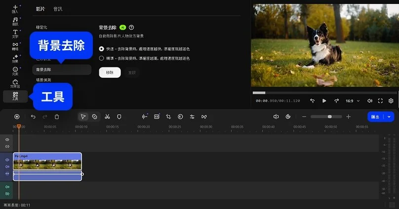 點開「工具」清理與優化素材,使用Movavi豐富的AI功能,如「消除雜訊」、「自動字幕」、「背景去除」,為接下來的特效與剪輯打好基礎。