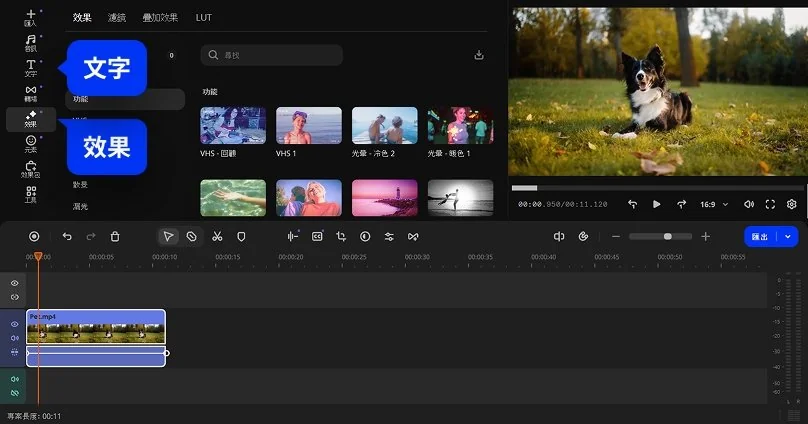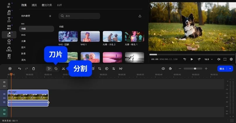 用分割工具快速剪除不需要的片段,或拖曳時間軸調整影片節奏。您也可以調整顏色、亮度、對比度,讓畫面更平衡。
