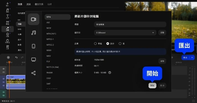 即時預覽完成的影片效果,然後點擊「匯出」,可選擇將影片存為 MKV、MP4、MOV 等多種輸出格式,或分享到YouTube、雲端空間上。