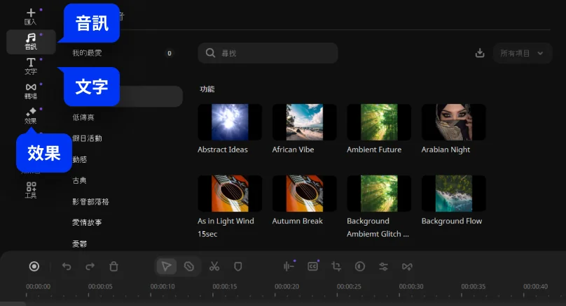特效現在已啟動,您隨時都可以使用。您可以在程式視窗左側的索引標籤中找到 Movavi Effects 的內容。按一下該標籤即可查看可用的音軌、標題、轉場效果等。