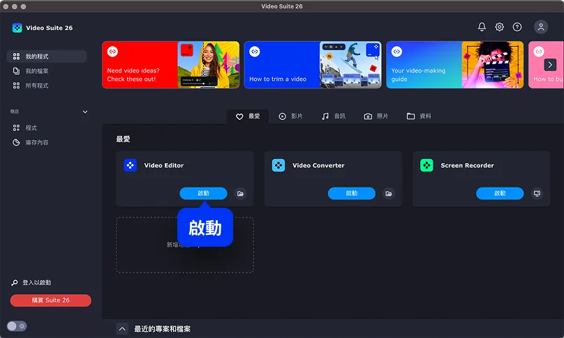 從主程式畫面啟動 Video Editor。您可以在預設開啟的最愛索引標籤或程式部分中找到該應用程式。