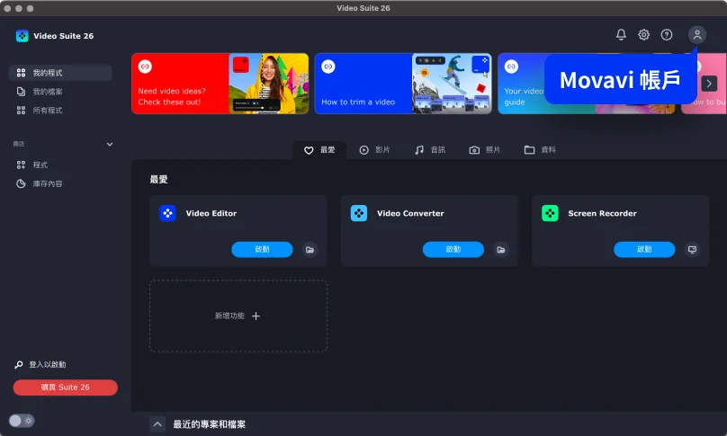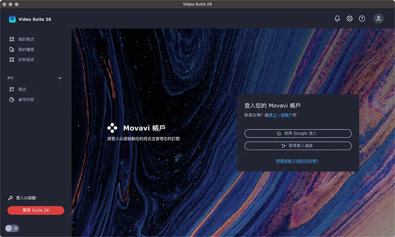 Movavi Video Suite 有三種啟動方式,您可以登入 Movavi 帳戶,也可以在 Video Suite 中輸入啟動金鑰,或者透過 Video Suite 中所包含的其中一個程式來啟動。