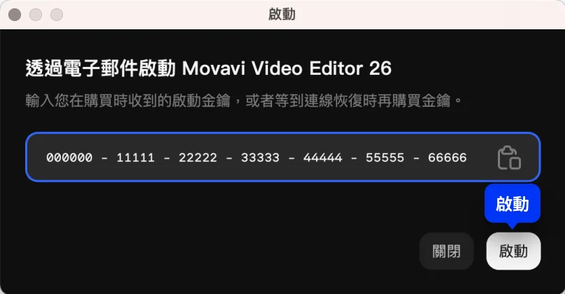 大多數的 Movavi 程式都有兩種版本:Windows 版和 macOS 版。請確認啟動電子郵件中所指出的正確版本。否則,您也可以聯繫 Movavi 支援團隊。 - 若要嘗試離線啟動,請務必將啟動與註冊金鑰在正確的欄位中貼上。