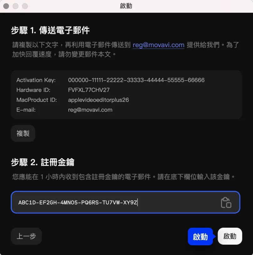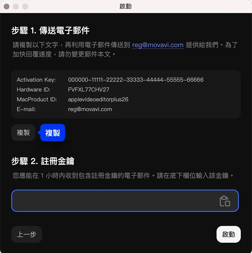 請將註冊金鑰從電子郵件中複製至啟動對話方塊的相應欄位之中。