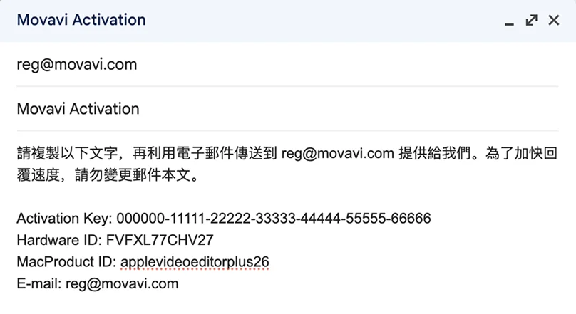 當您可以使用網際網路時,請使用您所偏好的郵件用戶端來撰寫電子郵件。請在郵件的本文中,請貼上您從啟動對話方塊中複製而來的資訊。接著將電子郵件寄送至 reg@movavi.com。