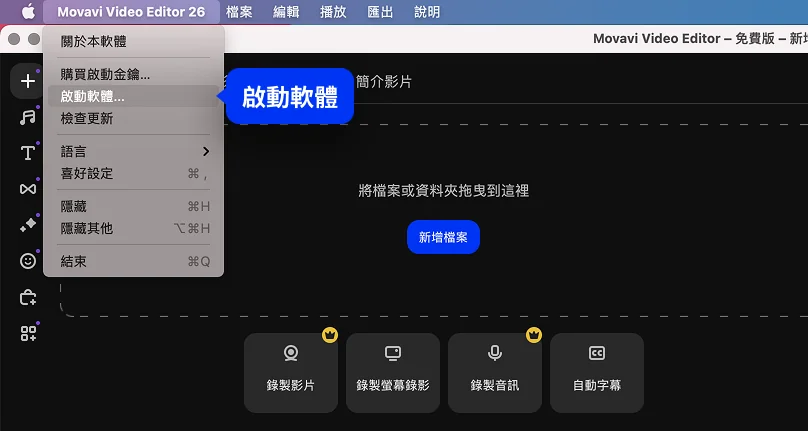 在 Movavi Video Editor 中,進入主程式選單並選取啟動軟體。