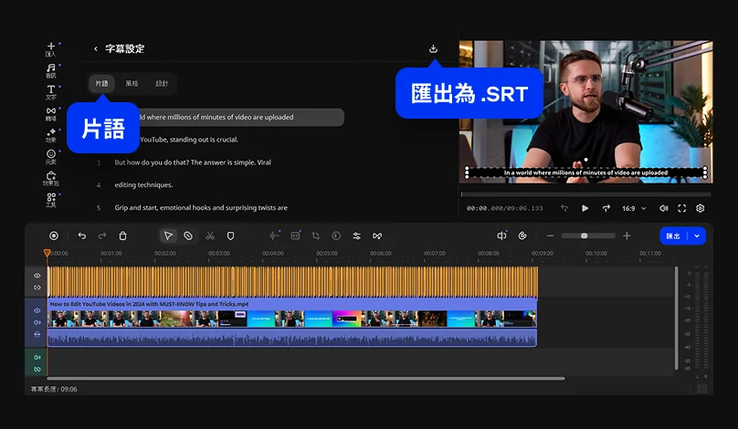 字幕備妥後,您就能在片語標籤上看見所有的行。您可以根據需要編輯裡面的文字。您也可以按一下 匯出為 .SRT 按鈕,將產生的字幕儲存為 SRT 檔案。