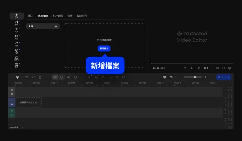 按一下新增檔案,然後選取您的影片,接著再將檔案拖放到時間軸上。