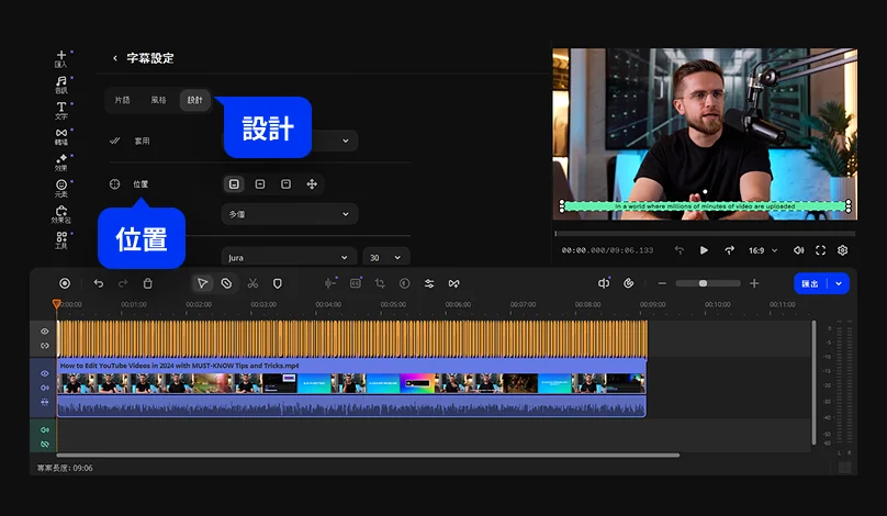 在設計索引標籤上,您可以找到各種字幕的設定。您可以使用底部、置中和頂部等選項,或者手動調整位置,來將字幕放在影片中任何您所想要的位置。