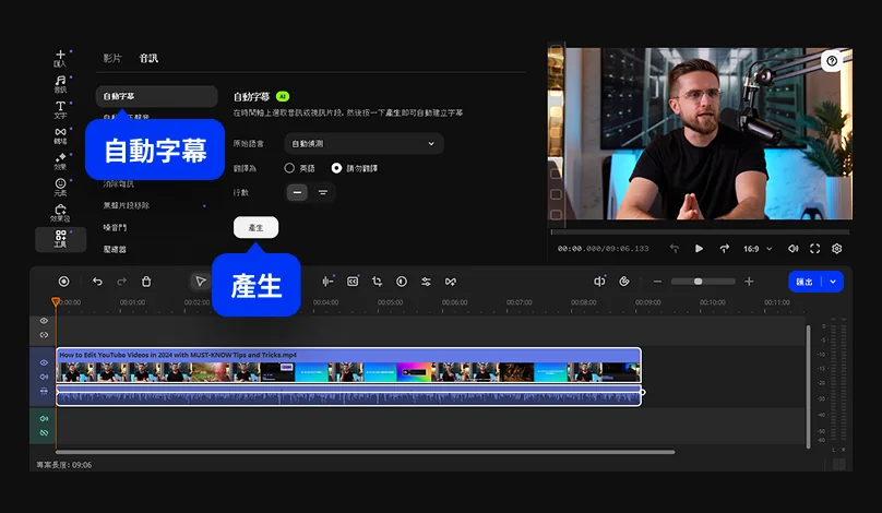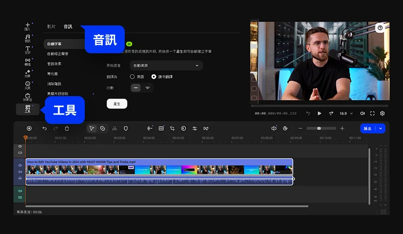 按一下時間軸上的影片,然後開啟工具。在音訊索引標籤上即可找到自動字幕。