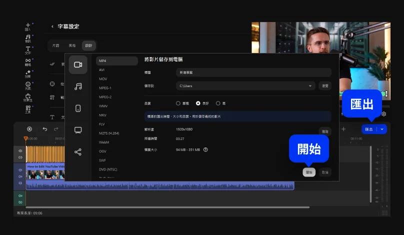 好極了!現在該儲存影片了。點選匯出按鈕,調整輸出設定,然後按一下開始。