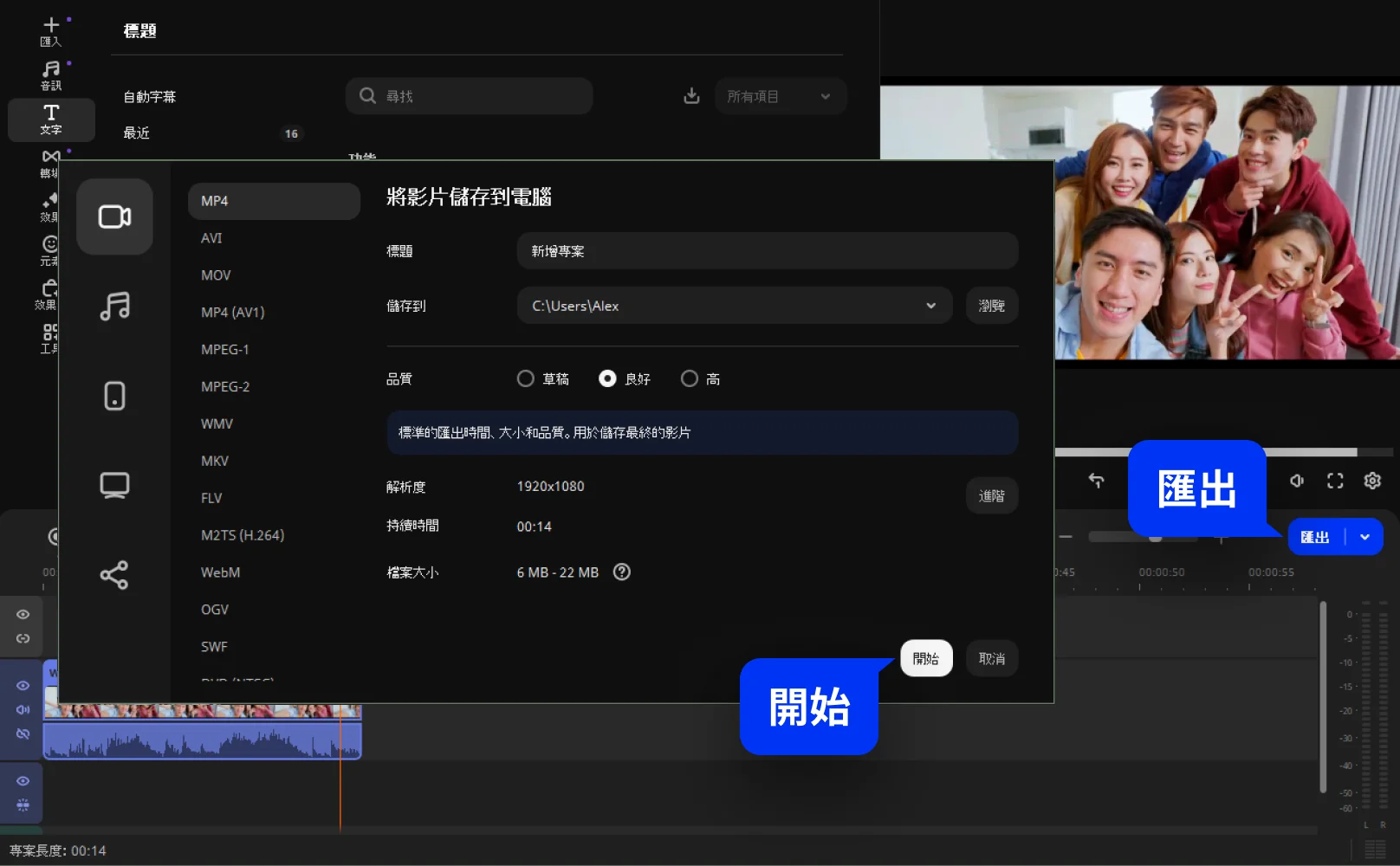完成字幕編輯後,點「匯出」並選擇要儲存的影片格式,軟體支援AVI、MP4、MKV等常見影片格式。按「開始」,即可將影片存為新檔案。