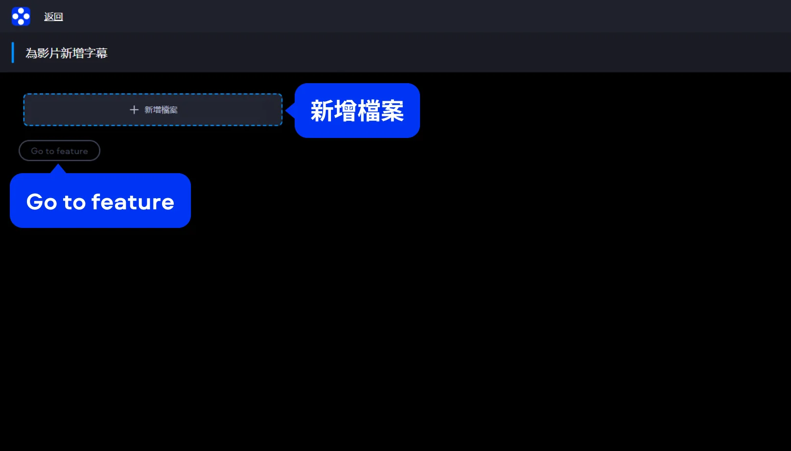 點擊線上工具的「新增檔案」按鈕,上傳要加字幕的影片檔,點「Go to feature」進行下一步。