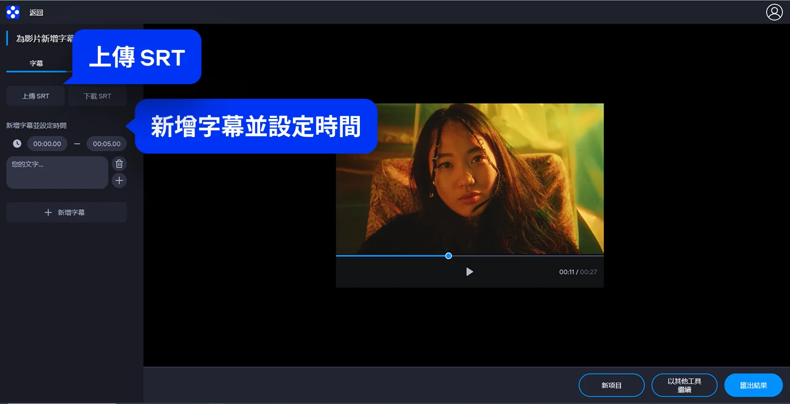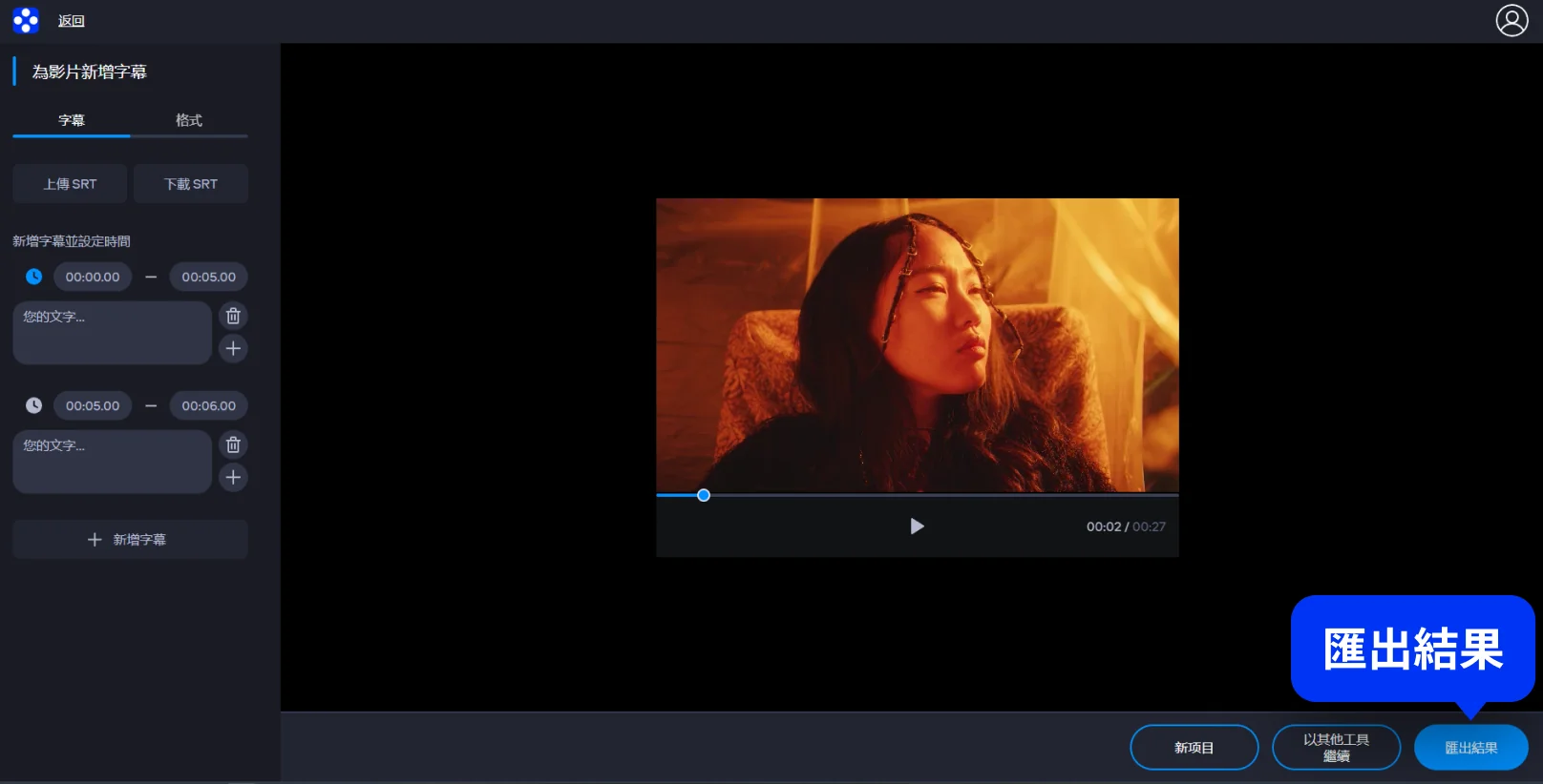 調字幕過程會即時顯示在右方預覽畫面中,確認好字幕內容與效果後,點擊「匯出結果」即可下載影片檔。