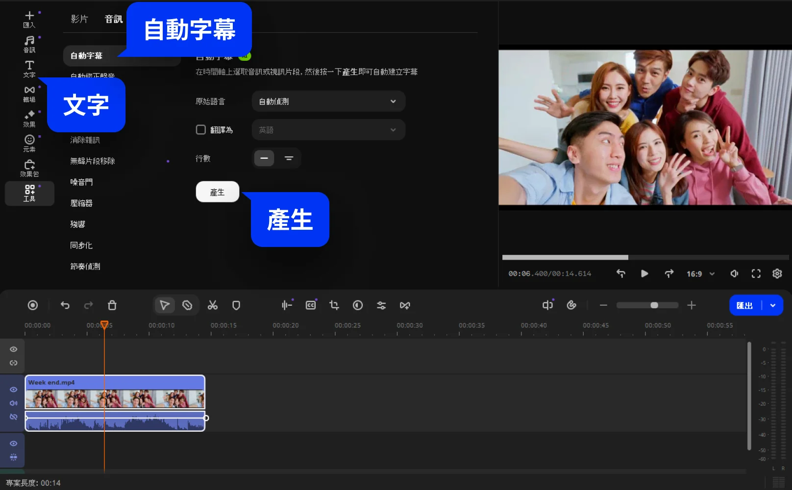 一鍵式 AI 工具:自動產生字幕、消除雜訊等