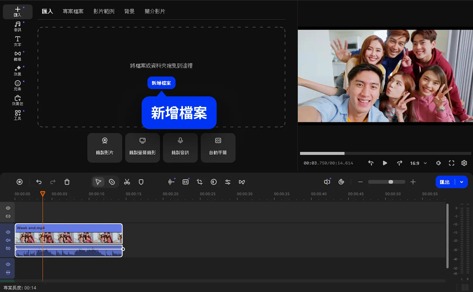 下載並開啟軟體,點擊「 新增檔案 」將欲編輯的影片加入媒體庫,接著將影片向下拖曳到時間軸上,即可開始編輯。