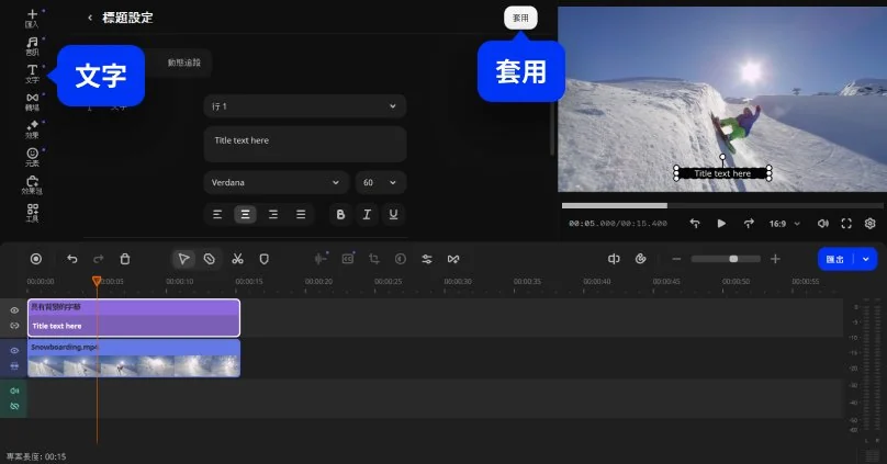 在左側工具列中,點進帶有「 文字 」,選擇您喜愛的文字風格,直接往下拖曳到時間軸的影片片段上方。接著就能輸入文字內容,並調整字體、大小、位置、樣式、顏色等,然後點選「 套用 」。