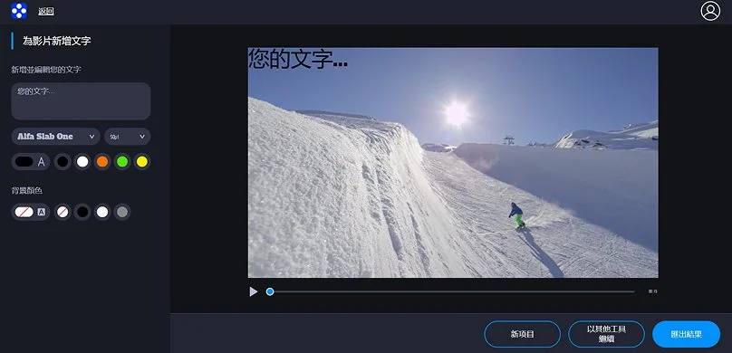 影片片段載入後,在左側的文字輸入框中輸入想加入的內容(中英文皆可)。接著可以調整文字的字型、大小、顏色與背景顏色。編輯完畢後,文字會出現在右側的影片預覽畫面中,您也可以拖曳文字位置,把字幕或標題放到最適合的地方。