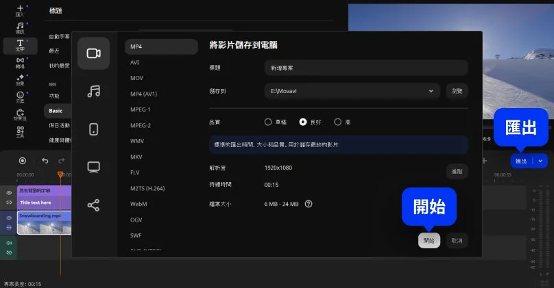 完成文字編輯後,點選「 匯出 」影片內容,就可以開始選擇影片素材要儲存成什麼格式(如MP4、MKV、MOV、AVI等)、畫質、解析度,都選好後再按「 開始 」就會自動下載處理好的影片內容。