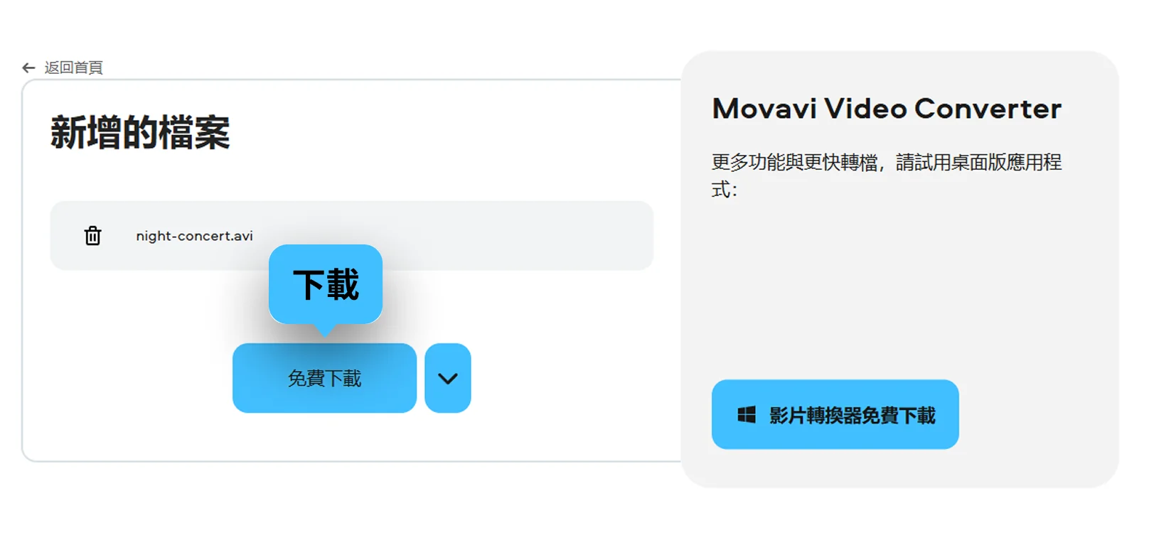 等待系統處理完畢後便可下載。點擊「下載」,將開啟檔案視窗,直接按「存檔」以預設名儲存或更改檔名後再存檔。整個Movavi線上流程簡單、快速,相當適合出門在外需要立即解決檔案太大問題的用戶。